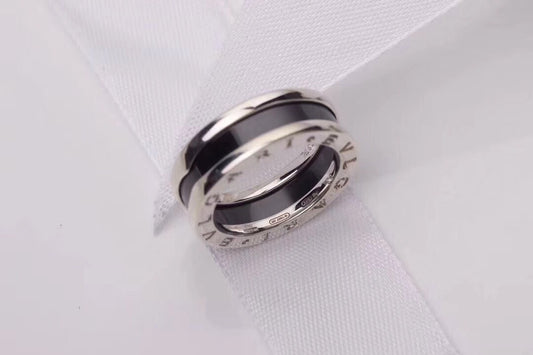 B.zero1 two-band ring with two 18 kt rose gold loops and a black ceramic spiral.
