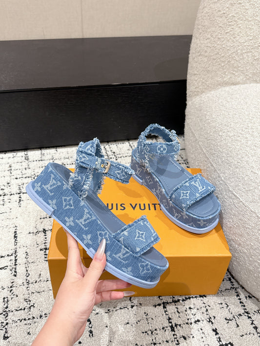 LOUIS VUIT 25/ Summer New Maya series denim square toe buckle one-strap sandals